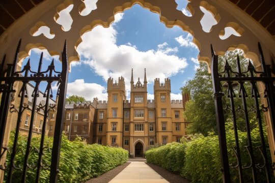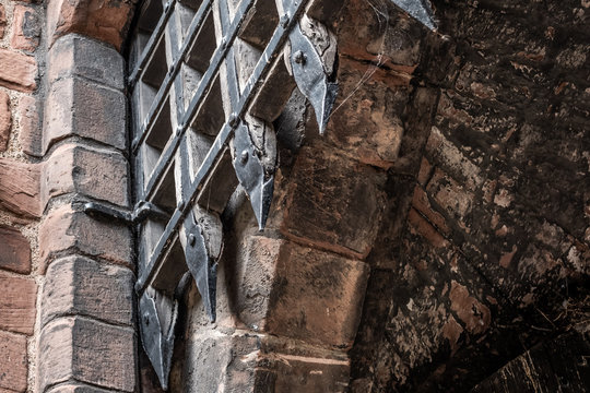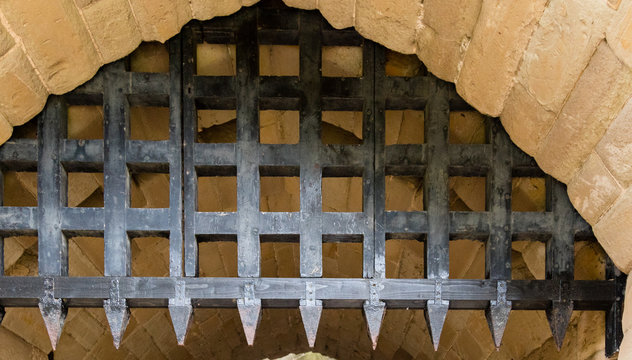 Medieval portcullis gate seen in the opened position at the entrance to a historic building. The sharp, leaded gate and archway can be seen in detail.