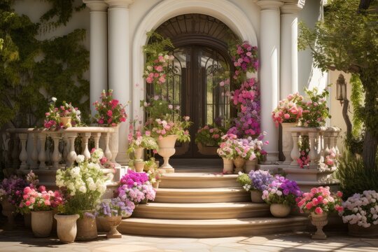 The entrance to the house is adorned with columns and accompanied by pots filled with vibrant floral arrangements.
