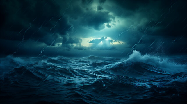 Epic nighttime storm scene at sea with rough waves with foam, rain, and the sky illuminated between dark clouds by lightning. Dangers of navigation with blue and cyan hues