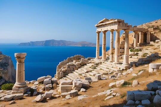 The ancient temple of poseidon at sounion, greece, stands in ruins overlooking the aegean sea on a clear, sunny day