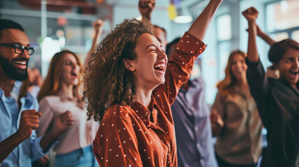 Group of people are celebrating in an office environment, with one woman in the center laughing and raising her arms in joy, surrounded by her colleagues who are also expressing happiness.