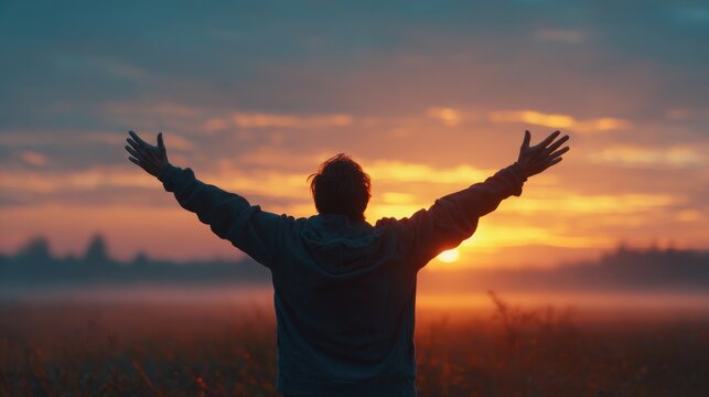 Cheerful young man with open arms in a sunrise field embodying positivity wellness and hope