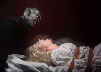 Creepy dolls, worn and eerie, standing in an abandoned room of a dilapidated doll factory at midnight. Generative AI