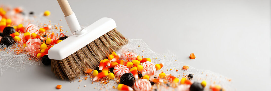 Broom sweeping colorful Halloween candy mix and cobwebs on a clean gray surface, festive concept of cleaning services or party planning