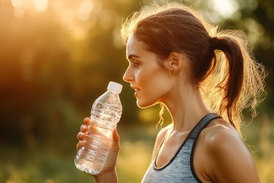 Hydrating woman drinking from sports bottle after workout with fitness icons overlay