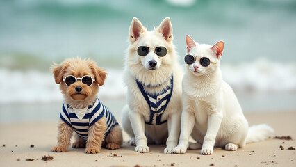 White dogs and cat sit together on a sandy beach, all wearing retro striped bathing suits, poster for vacation in retro style