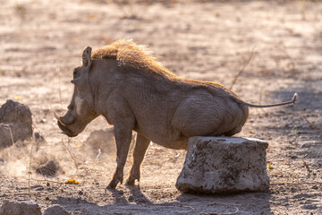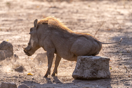 Closeup of a Common Warthog, Phacochoerus africanus, rubbing its posterior against a rock in Chobe National Park, Botswana.