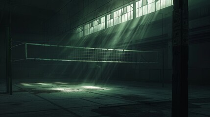In a dimly lit indoor volleyball court, a detailed net stretches across, anchored by sturdy posts, bathed in subtle backlight against a deeper dark background, creating an atmospheric scene with low l