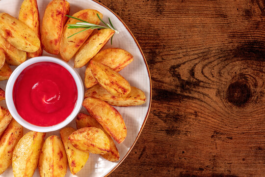 Baked potato wedges close-up top shot on a dark rustic wooden background