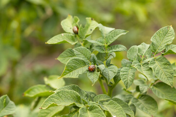 Colorado beetles and their larvae eat the potato leaf. Sunlight.