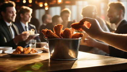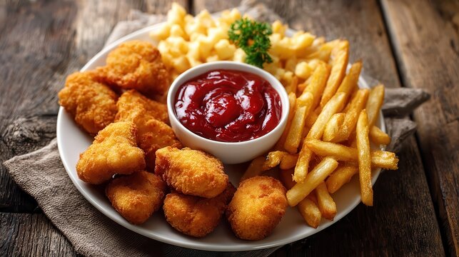 Fried Chicken Snack: Crispy and Delicious Fast Food Meal with Fresh Nuggets and Potato on Wood Table