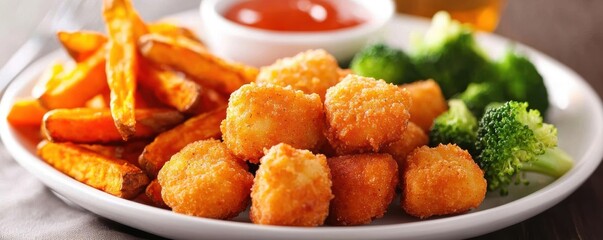 Crispy fried chicken nuggets served with sweet potato fries and broccoli.