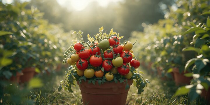 Red and green tomatoes in pots highlighting plant care and growth, suitable for World Gardening Day