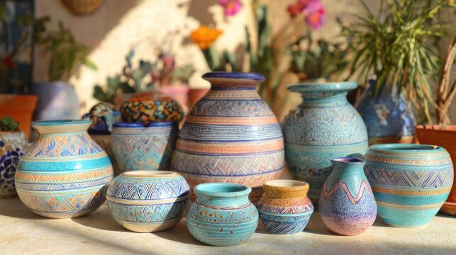 Colorful pottery collection in a sunlit outdoor workshop in Mexico