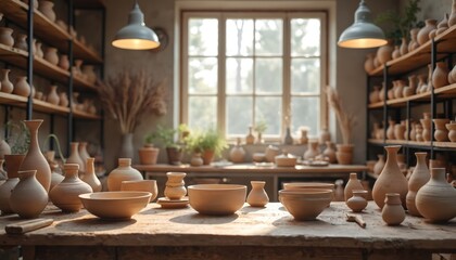 Unfired clay pots and vases on wooden table in studio workshop. Shelves filled with ceramic vessels, natural light from window illuminates craft space. Handmade earthenware display.