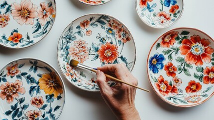 A hand paints floral designs on decorative plates, showcasing craftsmanship and artistic expression in a vibrant, creative setting.