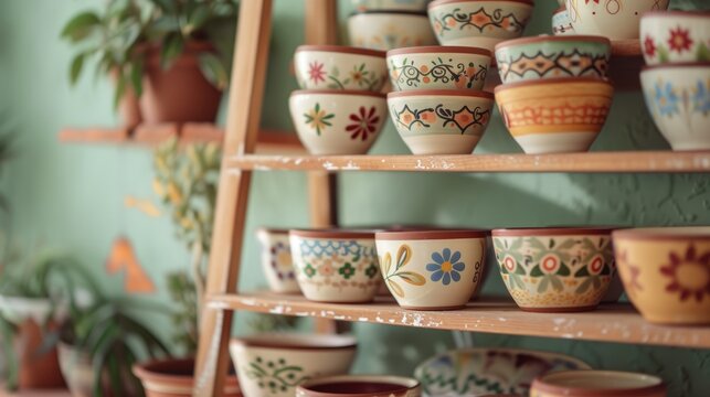 A close-up of vibrant hand-painted terracotta pots arranged on wooden shelves
