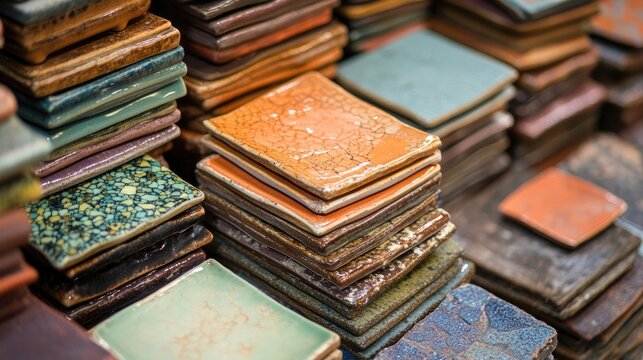 Ceramics displayed as a collection of many ceramic tiles beautifully stacked, captured in a close-up image with ample copy space for design use.