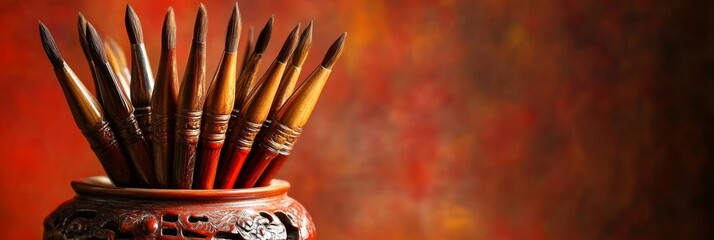 A Vibrant Display of Artist Brushes Standing Tall in a Decorative Pot Against a Colorful Background Perfect for Creative Inspiration and Art Themes