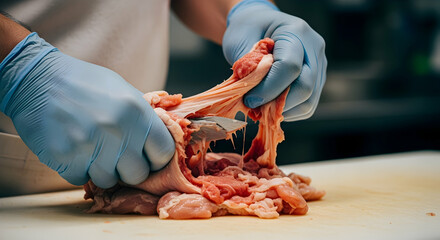 Preparing Raw Meat By a Person Wearing Hygienic Gloves In Kitchen