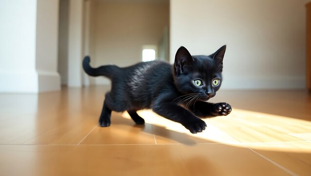 Black kitten with green eyes pouncing on a light wood floor in a bright indoor setting looking playful | international cat day