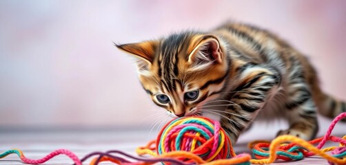 Tabby kitten intently pouncing on colorful yarn ball,   spring,   domestic animal