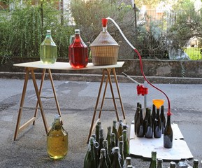 Cheerful groom pouring champagne at joyful outdoor wedding