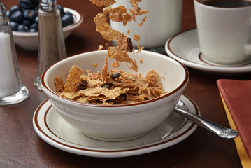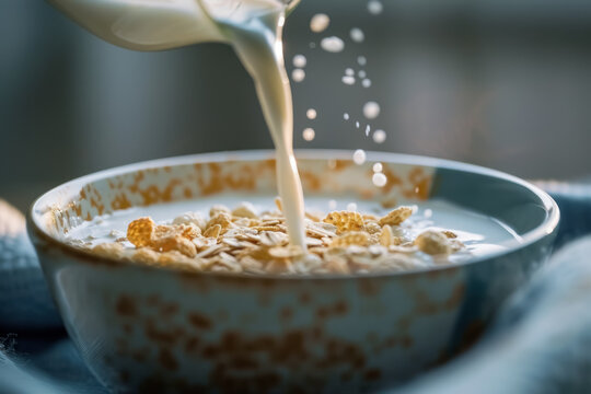 pouring milk into a bowl of cereal with honey flakes on a cozy morning