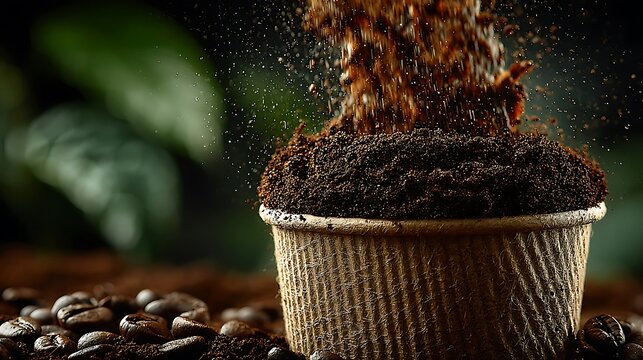 Coffee grounds pouring into a textured cup with scattered beans and blurred green foliage background