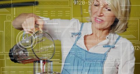 Scientist analyzing data with statistics overlay in laboratory