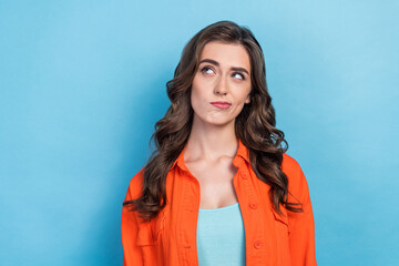Portrait photo of young pretty thinking cute brunet hair lady pouty lips look minded empty space uncertain decision isolated on blue color background