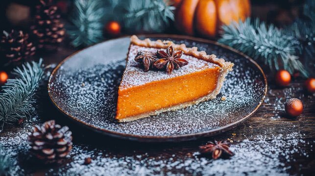 Slice of pumpkin pie, dusted with powder, on plate with seasonal decorations