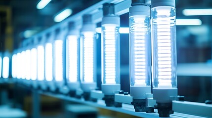 Row of fluorescent tubes glowing brightly in an industrial setting representing power and efficiency