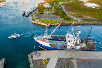 Aerial view of a large fishing trawler moored at a marina with a small power boat along side