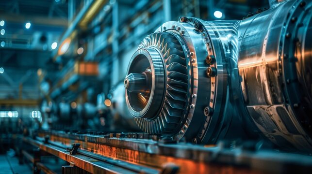 Large turbine engine in focus, highlighting the precision and power of modern industry, raw and detailed, technological marvel