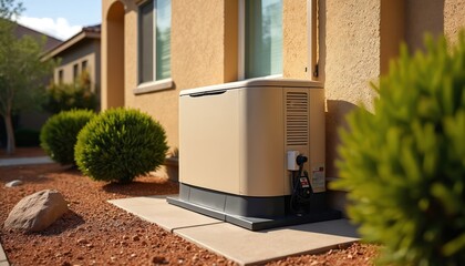 Standby generator unit installed outdoors next to residential building. Automatic power system provides reliable electricity supply for home backup protection, peace of mind during outages. Ensures