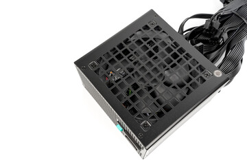 Computer power supply unit isolated on white background. Power supply for motherboard computer.