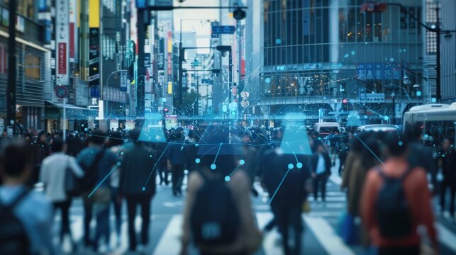 Diverse businesspeople walking with financial graphs overlay