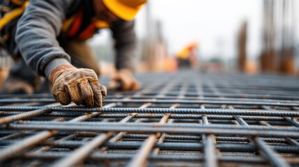 Medium shot capturing an ironworker wearing a powered exoskeleton while aligning steel rebar mats on a bridge deck with the workers upper body in clear focus and rest softly