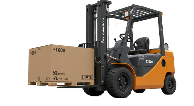 Orange Forklift Truck Lifting Cardboard Box on Pallet Isolated