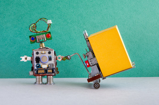 Robot courier moving big yellow container with powered pallet jack. Forklift cart mechanism on green wall gray floor background. Robotic logistic delivery service concept. Copy space