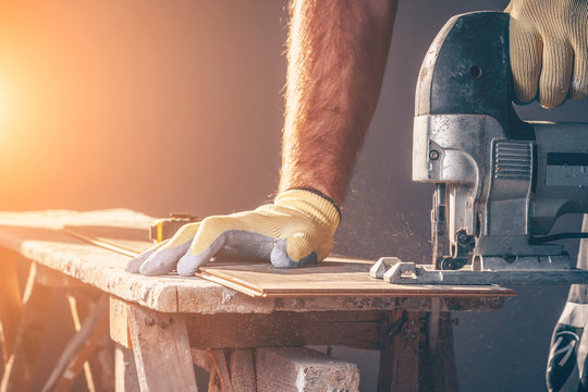 Close-up sawing jigsaw in the board, the process of cutting the board