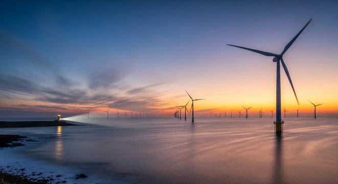 A breathtaking long-exposure shot of an offshore wind farm at sunrise, capturing the serene and powerful beauty of renewable energy