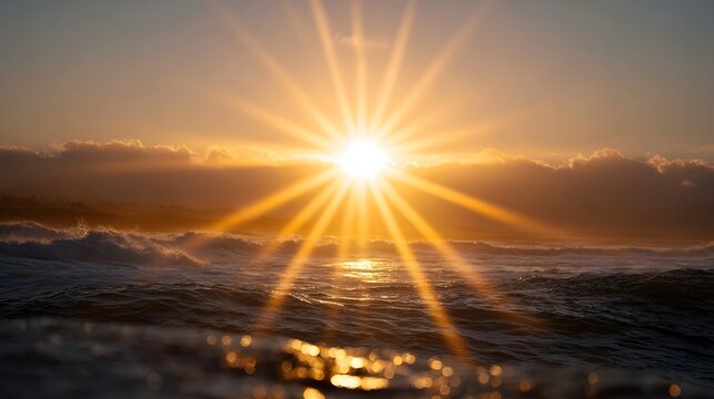 Majestic sunrise over the ocean with powerful sunburst and crashing waves