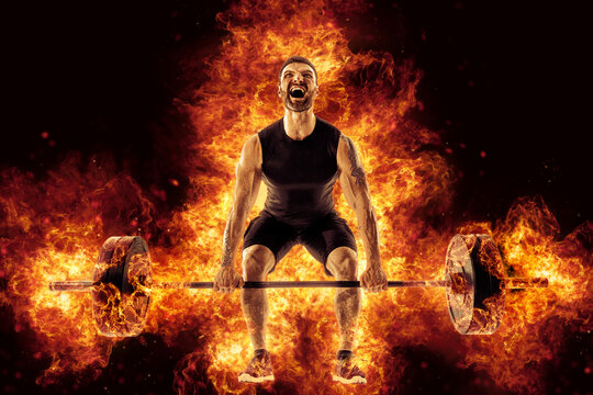 Portrait of an athlete who is lifting the barbell in the gym. The concept of sport and healthy lifestyle. Mixed media