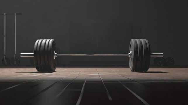 Heavyweight Olympic Barbell with Large Dumbbell Weights on a Dark Gym Floor for Strength Training and Powerlifting Exercises in a Professional Fitness Facility