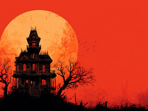 illustration of haunted house silhouette against full moon, vector halloween background, spooky night