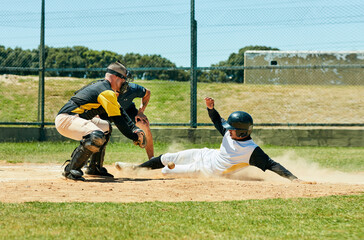In baseball you need to be up for the challenge. Full length shot of a young baseball player reaching base during a match on the field.