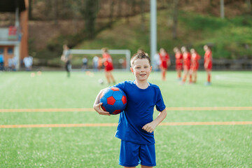 Group of Soccer Players Standing in Line and Kicking Balls at Grass Practice Pitch. Youth Footballers on Training Session