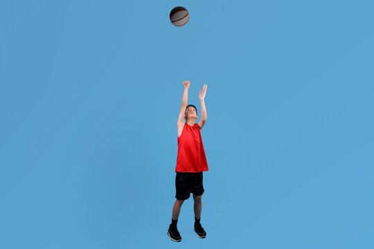 Full body of Asian teenage boy in red jersey jumping to shoot basketball against blue background.